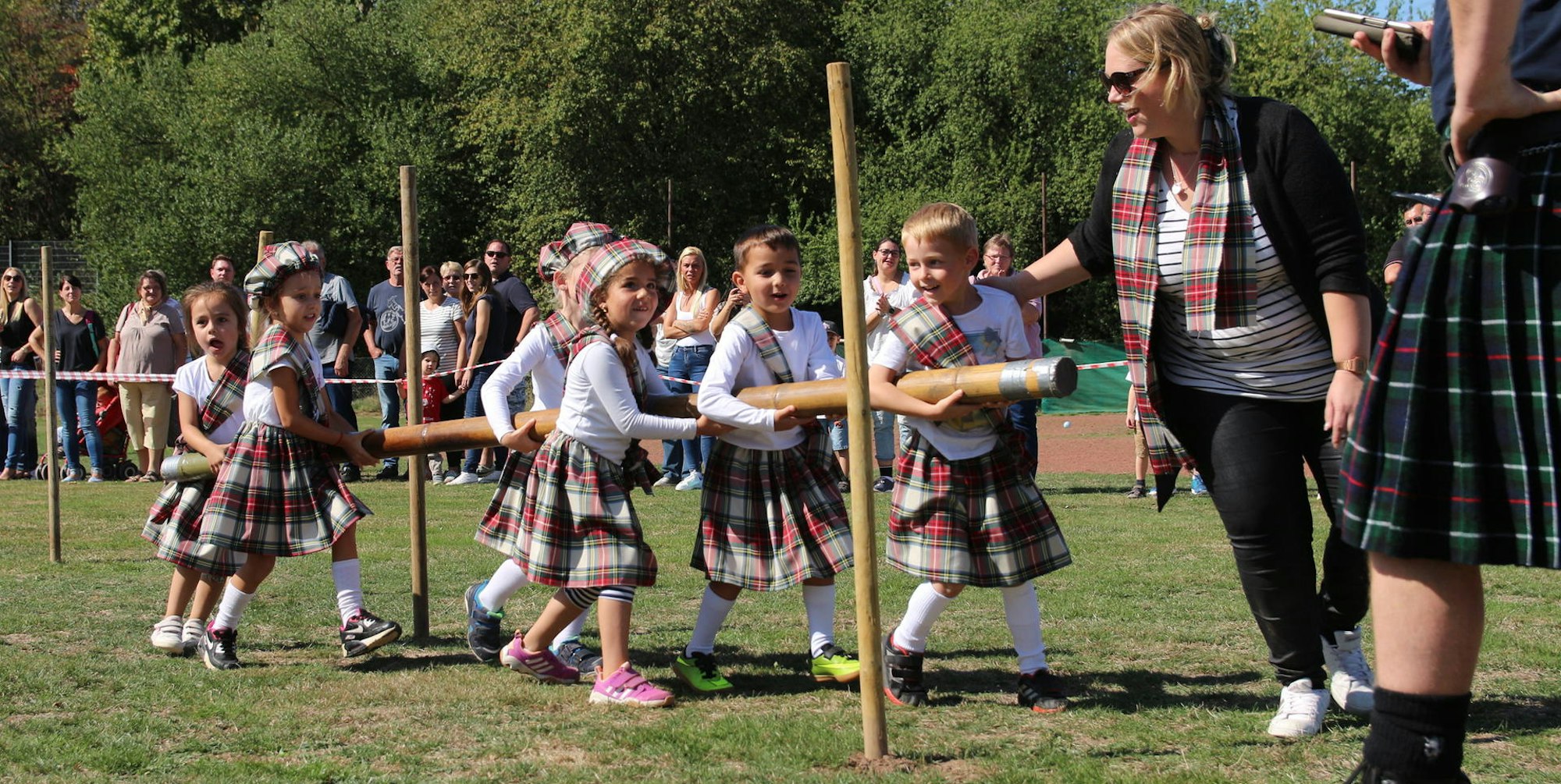 Highland Games in PulheimKita-Kinder kämpfen mit Kilt und Bonnet