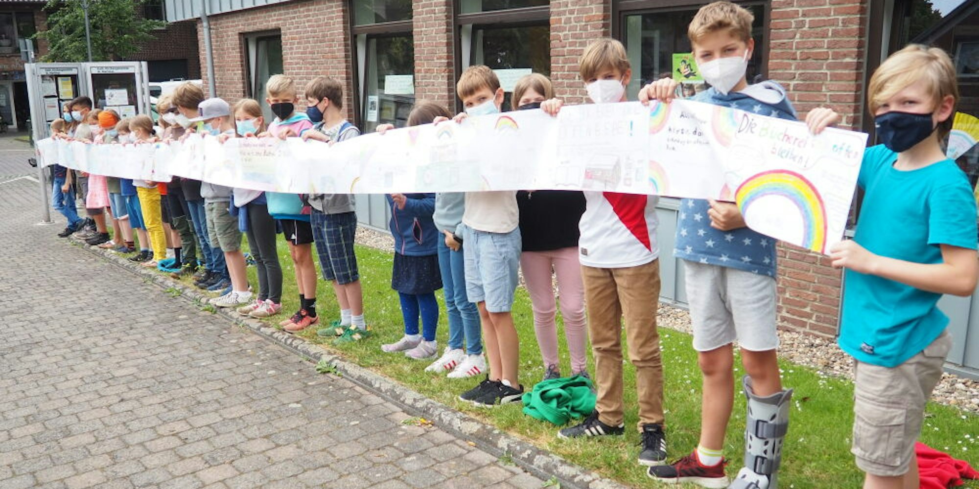 Bei einer Protestaktion im Juni hatten Kinder aus Schule und Kita darauf aufmerksam gemacht, wie wichtig ihnen die Bücherei mitten im Ort ist. Sie hatten Bilder gemalt, die sie zu einem langen Transparent zusammengefügt hatten, und stimmten Sprechgesänge an. Im digitalen Gästebuch haben viele Menschen geschrieben, dass die Bibliothek nicht nur ein Ort der Bildung, sondern auch der Begegnung sei: „Wir brauchen ein Lächeln, wir brauchen Austausch.“
