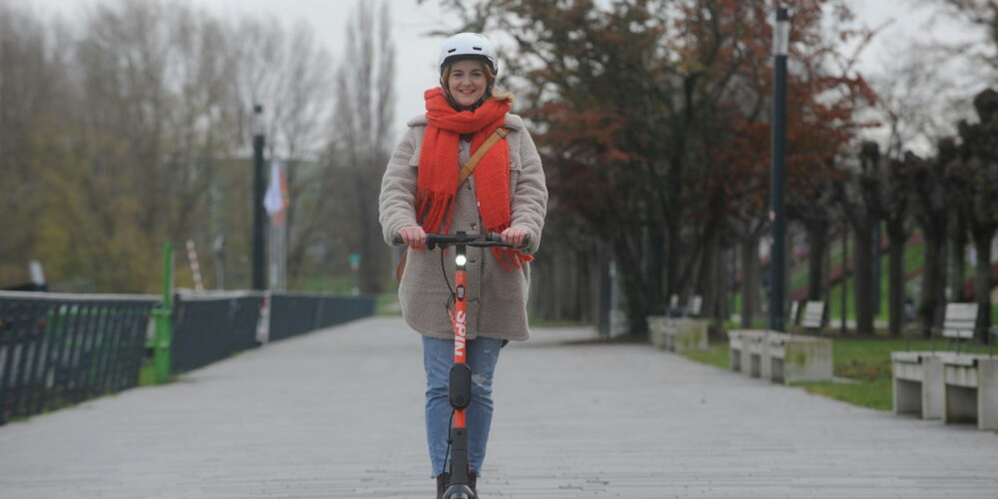 Fahrspaß auf kurzen Wegen: Das Tragen eines Fahrradhelms wird auf den E-Scootern empfohlen.