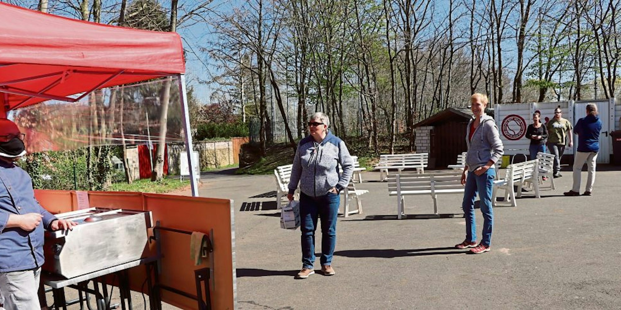 Hürth-Gleuel – Wolfgang Niebach (73) hatte seiner Frau am Samstag versprochen, sich ums Mittagessen zu kümmern. Und er hielt Wort. Doch am Herd schwitzen musste der Mann aus Gleuel dafür nicht. Gemütlich spazierte er vielmehr zum Gelände seines Tennisclubs, dem TC Gleuel. Am Eingang hatten die beiden Betreiber des Restaurants „Freddies“ ein Drive-in- beziehungsweise Go-in-Barbecue aufgebaut.