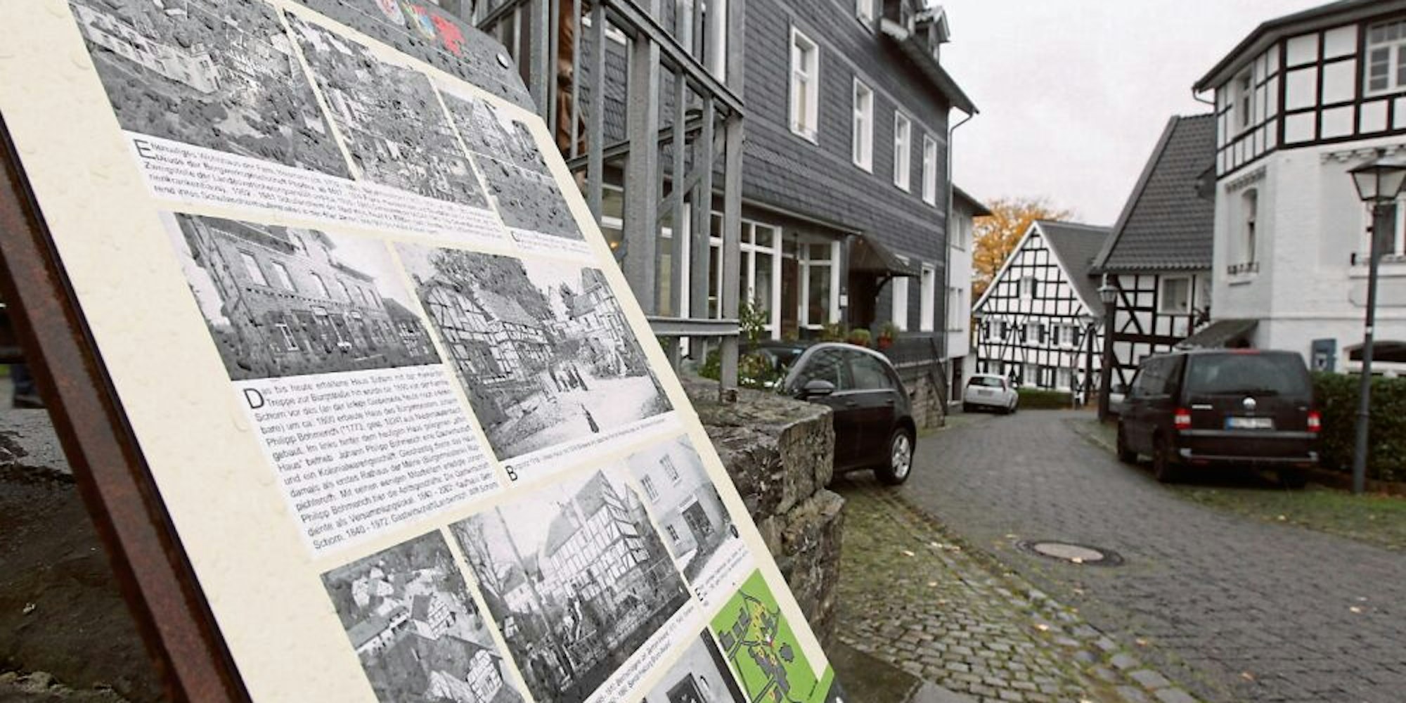 Ruppichteroth – Wer 1918 am Burgplatz stand, blickte auf eine bäuerlich geprägte Szenerie, auf Fachwerkhäuser und landwirtschaftliches Gerät. Und da gab es auch die Bäckerei. Bis 1939 gehörte sie der jüdischen Familie Regensburger, deren Mitglieder Opfer der Shoah wurden. Die neue historische Tafel, montiert vor der Treppe zur katholischen Kirche, gewährt mit alten Fotografien einen Einblick in die Geschichte des Areals an der Burgstraße – mit Haus Weiand, dem ehemaligen Sanatorium von Dr. Herzfeld oder dem Wirtshaus an St. Severin.