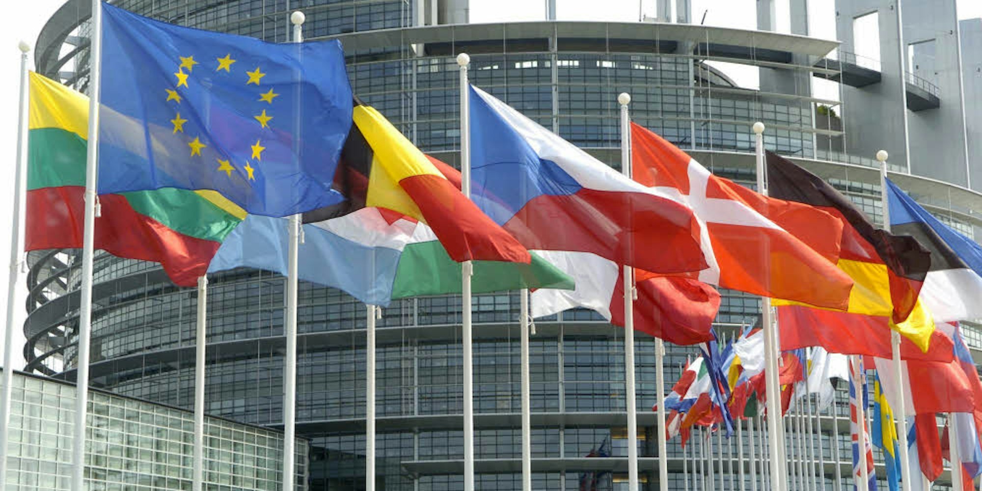 Die Flaggen der Mitgliedsländer der Europäischen Union wehen vor dem Europa-Parlament in Straßburg.