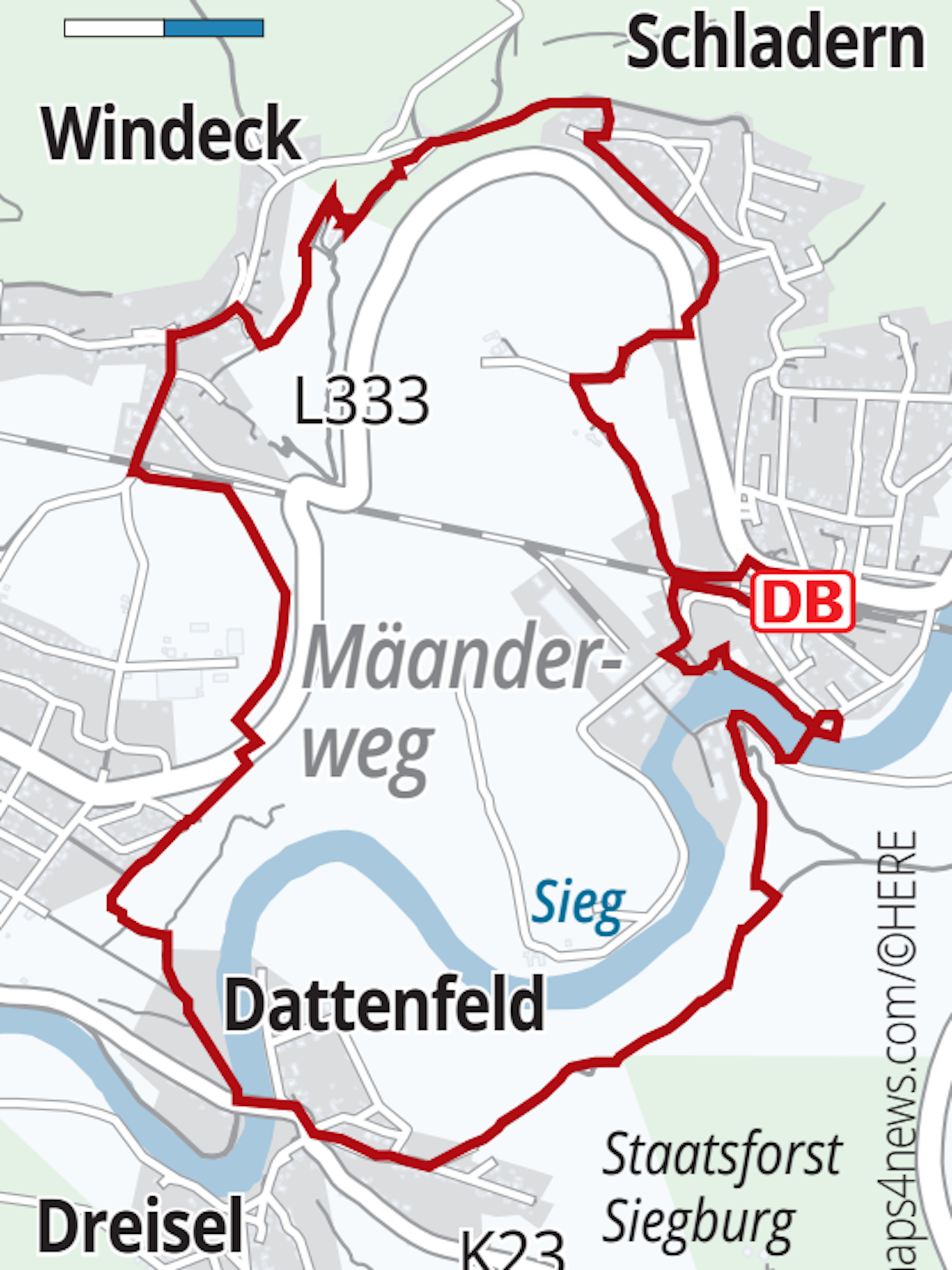 Beim Blick auf den Verlauf der Sieg auf Landkarten oder im Internet fallen die zahlreichen Schleifen auf, in denen der Fluss durchs Land mäandert. Dass es einst noch mehr Kurven waren, ist zum Teil auch in der Landschaft noch zu erkennen. Der 8,1 Kilometer lange und auf drei bis vier Stunden konzipierte Mäanderweg greift das Thema auf.