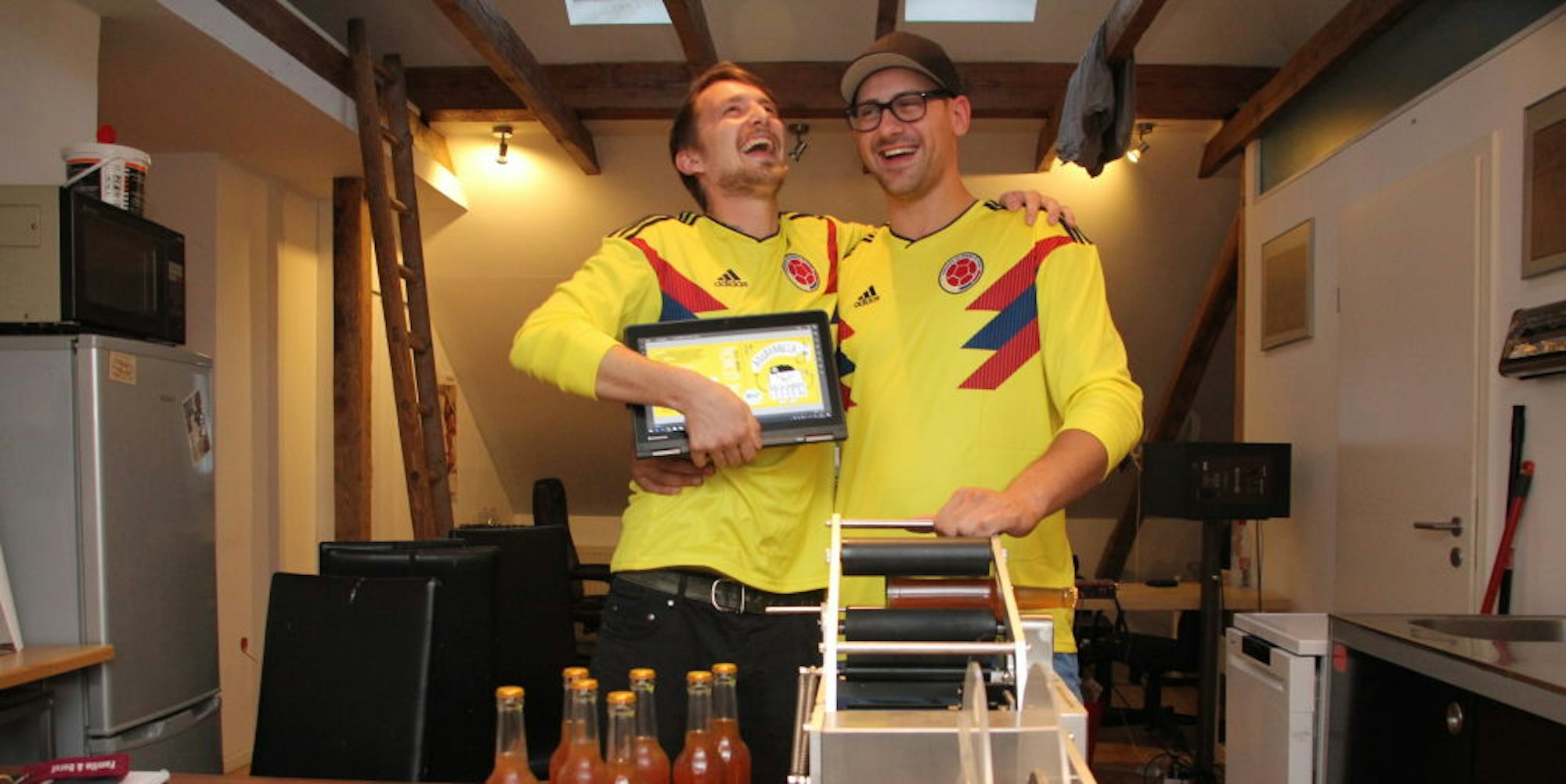 Hennef – Der große 110-Liter-Kochtopf steht im Vorratsraum, gleich daneben eine alte Etikettiermaschine, Baujahr anno Tobak. Letztere haben Philip Schmitz und Felix Land gebraucht erstanden, der Topf ist nagelneu. Noch weitere Teile ihrer selbstgebauten Abfüllanlage für „Aguapanela Akkaro“ lagern in der kleinen Mansardenwohnung am Horstmannsteg.