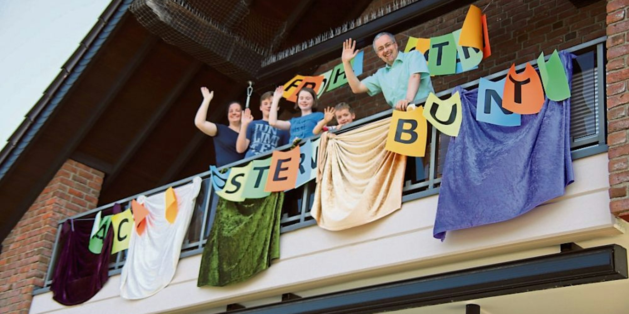 Der evangelische Pfarrer Niko Herzner hängte noch, als um 12 Uhr bereits die Glocken aller Kirchen schlugen, seine bunte Stoffvielfalt nach draußen, schwenkte den Teleskopfahnenmast. Sein Pfarrhaus an der Kurhausstraße war sicher eines der buntesten Gebäude im Zentrum. Als das Geläut verstummte, rief er mit seiner ganzen Familie „Der Herr ist auferstanden – er ist wahrhaftig auferstanden“. Dann geschah, was er kaum erwartet hatte. Aus verschiedenen Richtungen erhielt er Antwort, bunte Tücher und fröhliche Menschen waren auf den Balkonen zu sehen. In großen Lettern tauchte in Lauthausen das Motto am Balkon seines Kollegen Dr. Stefan Heinemann auf, nebst, na klar, bunter Tücher.