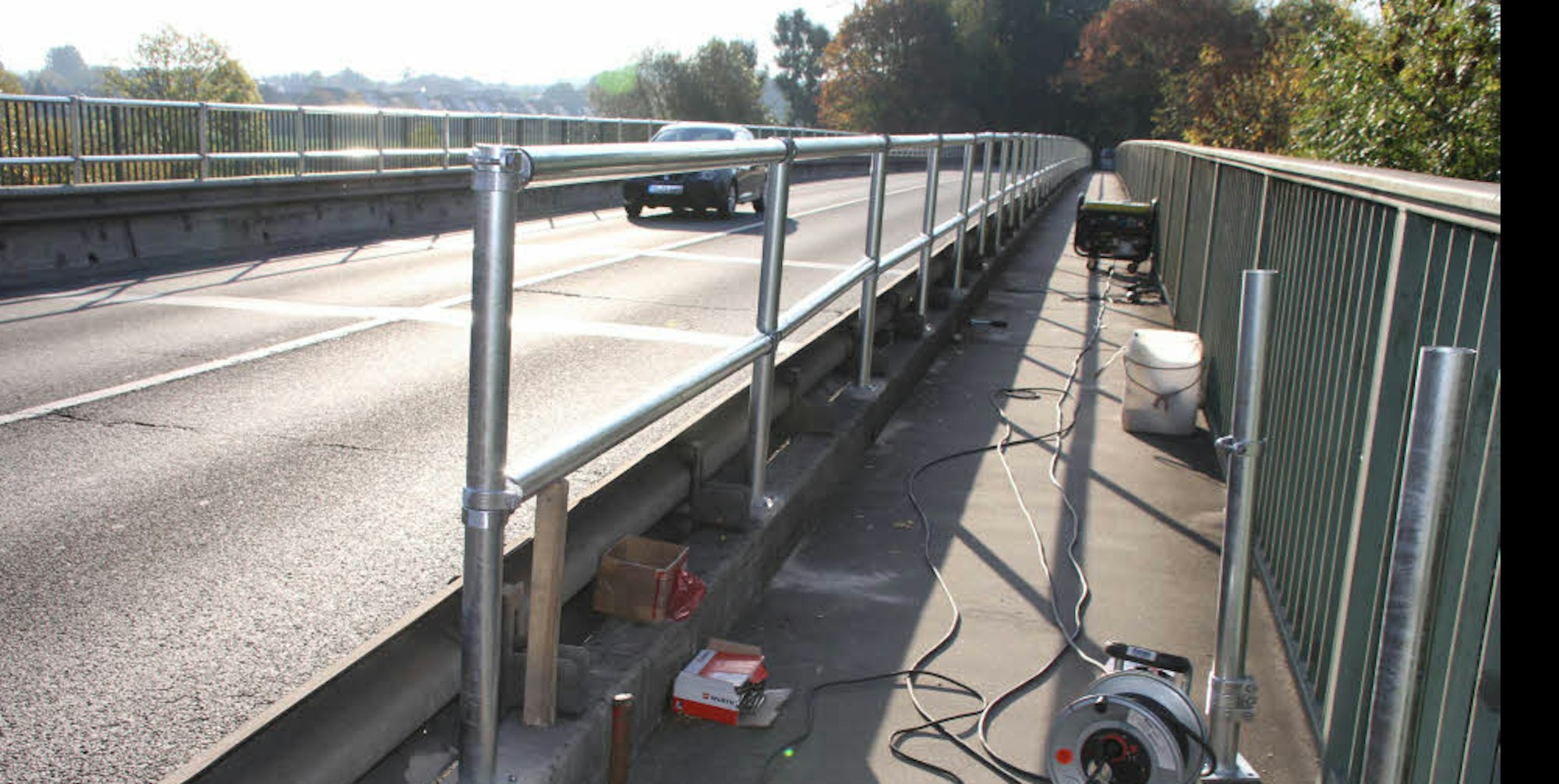 Die Stadtverwaltung erledigte ihre Hausaufgaben schnell. Der Geh- und Radweg bis zur Einmündung des Allner Wegs wurde verbreitert, der Baubetriebshof schüttete Schotter auf. In Gesprächen mit dem Landesbetrieb Straßenbau wurde der ungleich aufwendigere Schutz auf der Brücke selbst abgestimmt. Die Maßnahme selbst war unstrittig, musste aber erst geplant und in Auftrag gegeben werden. Inzwischen sind beide Seiten schon fertig gestellt, am Mittwoch räumte die Firma Notstromaggregate und Maschinen weg. Damit können sich Passanten und Radfahrer weit sicherer als bisher fühlen.
