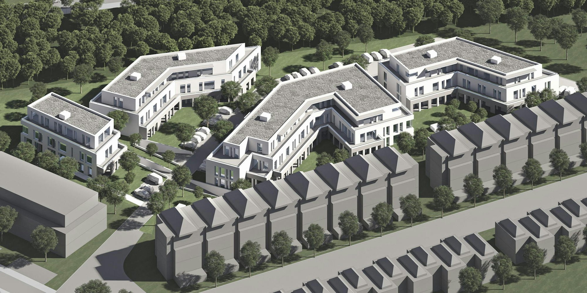 Auf vier Baukörper verteilen sich die neuen Wohnungen, links steht das geplante Ärztehaus.