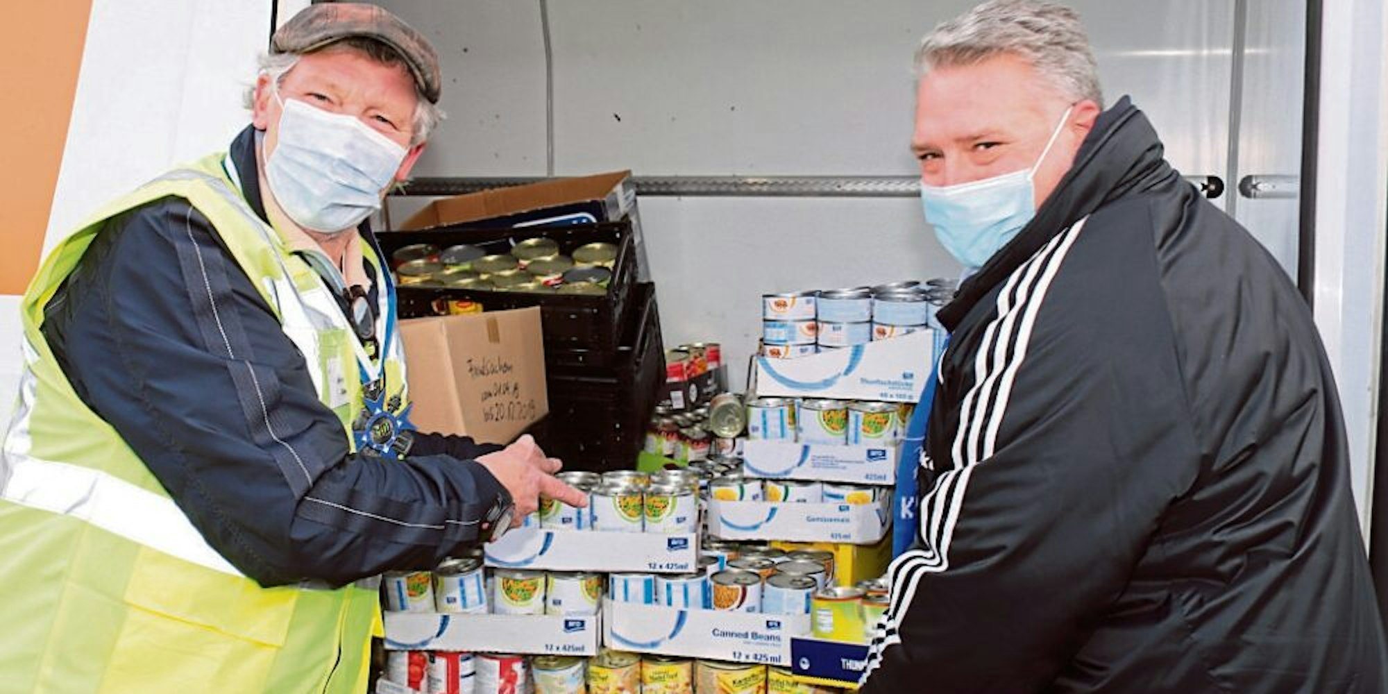 Werner Zuber von der Tafel (l.) und Präsident Torsten Büllesbach packten an beim Verladen der Dosen.