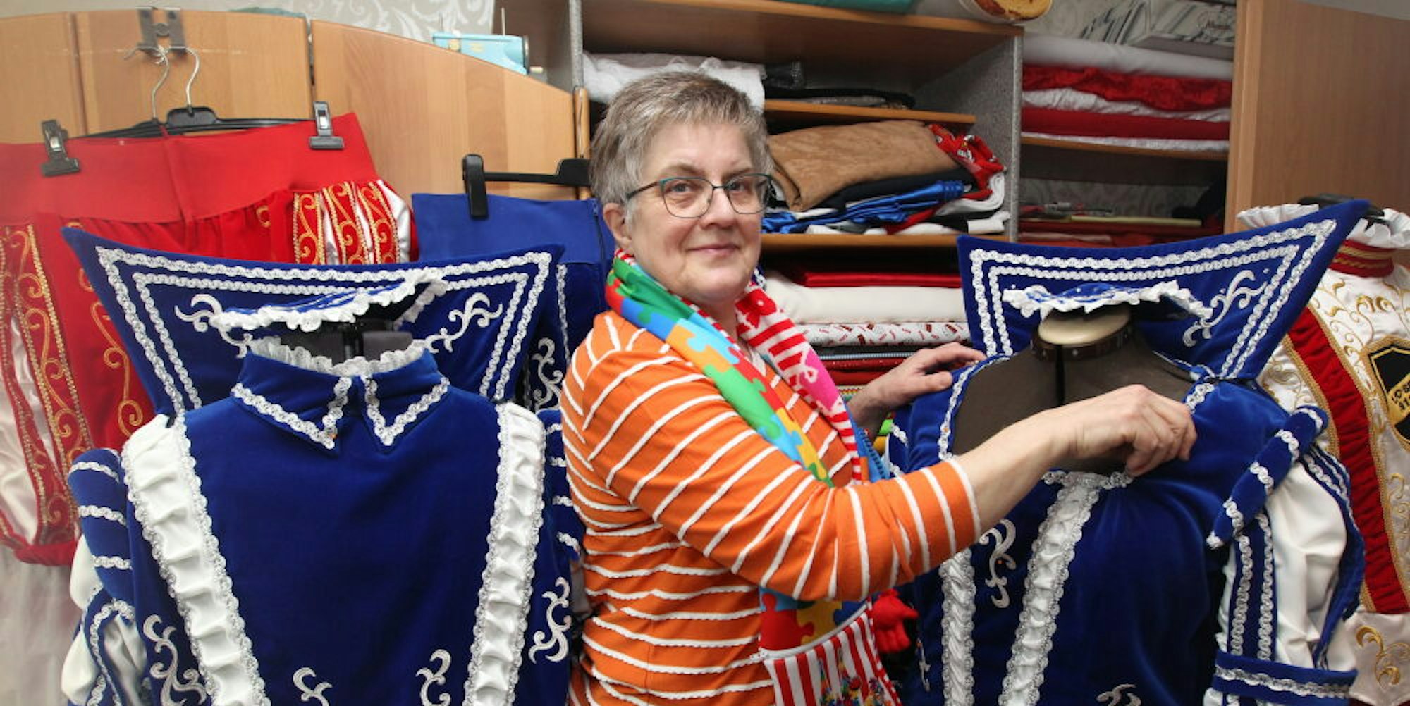 Aufwendig sind die Kostüme der Tollitäten, die Käthe Laschke schneidert. Den Mottoschal aber kaufte sie zur eigenen Aufheiterung.
