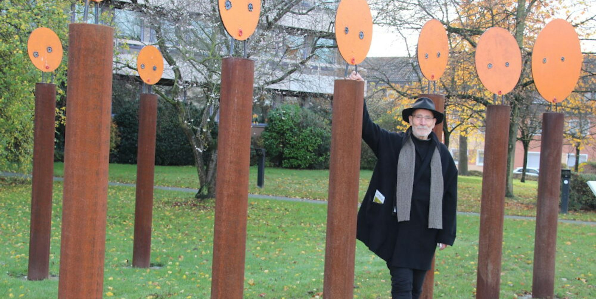 Der Jubilar Giovanni Vetere mit seiner Installation „Die Zehn + Zwei“ am Troisdorfer Rathaus.