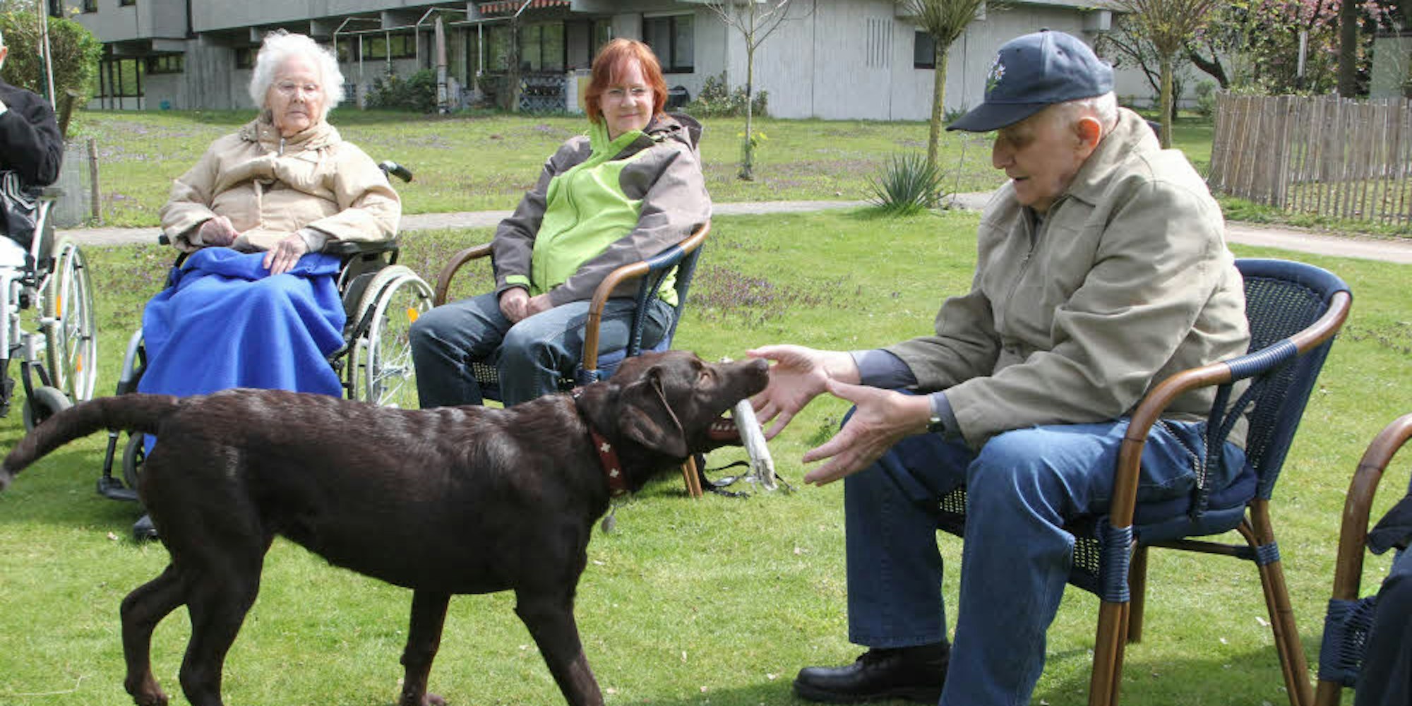 Auf die Frage „Ist dir das peinlich?“ senkt sie den Kopf und legt ihn auf den Befehl „Knie“ in den Schoß der Umsitzenden. „Wunderbar“, schwärmt ein 87-Jähriger und hält dem Tier etwas zaghaft einen Käsewürfel hin. „Sie ist vorsichtig“, beruhigt ihn Isabelle Jacobs, „sie hat nur eine große Schnauze“. Lachen. „Es ist ein Verhaltenstraining auch für uns“, sagt Vera Druckrey, für die Bewohner und für die Mitarbeiter, die in der Runde ebenfalls willkommen sind.