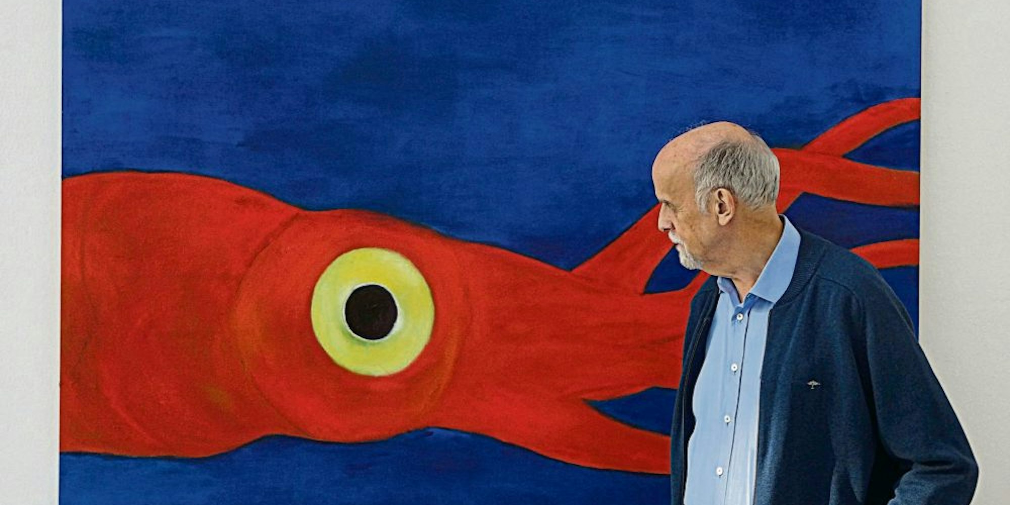 Das Auge des Riesenkalmar blickt dem Betrachter in Originalgröße entgegen: René Böll in seiner Ausstellung.