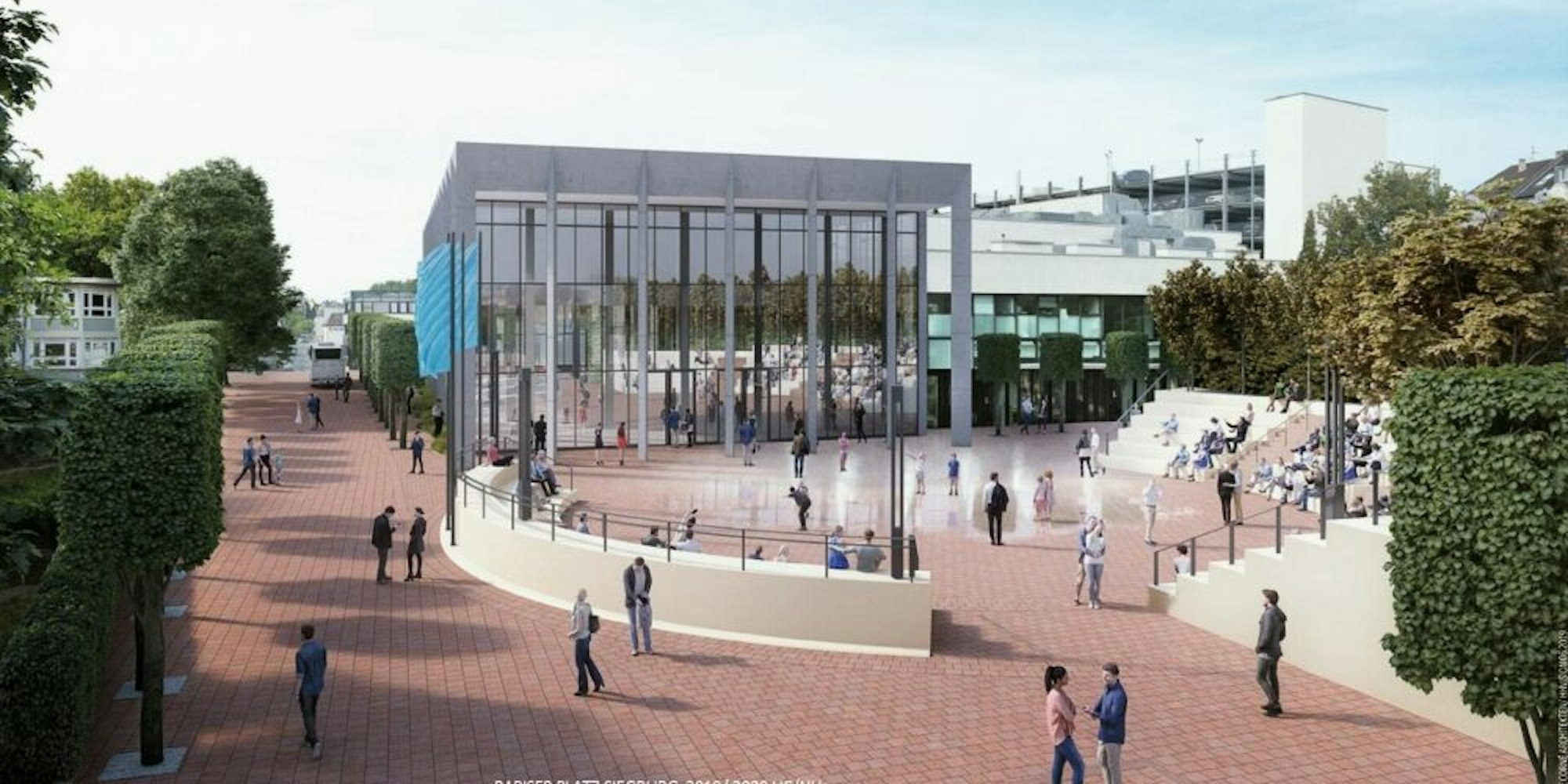 Kreissegmente mit Tribünenplätzen fassen den Vorplatz ein, den Architekt Hartmut de Corné entworfen hat. Der Blick auf die Halle soll nicht beeinträchtigt werden.
