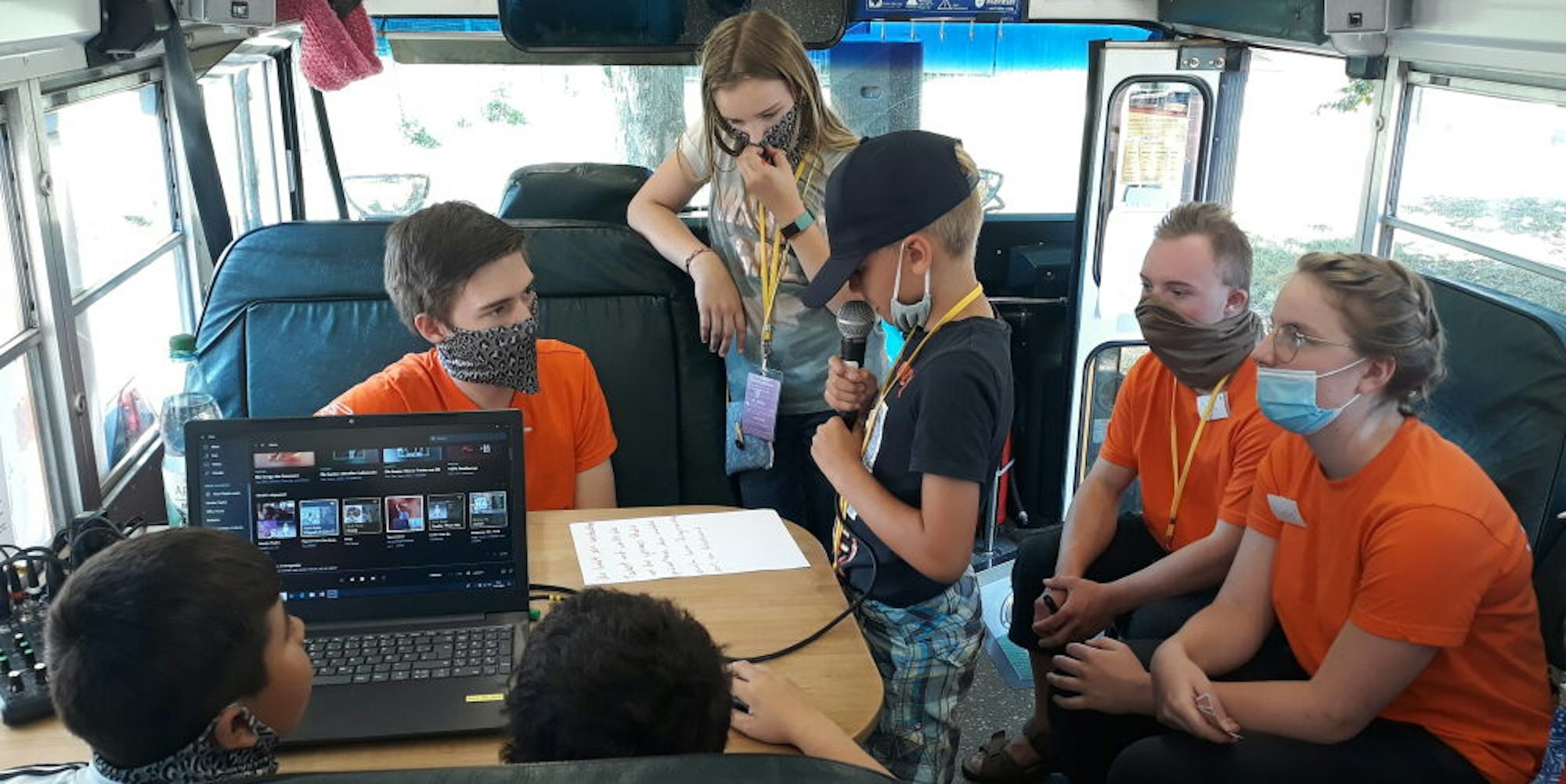 In dem gelben Jugendkulturbus produziert das Medienteam eine tägliche Radiosendung. Einen Musikwunsch erfüllt die Radioredaktion für sechs „Siegis“.