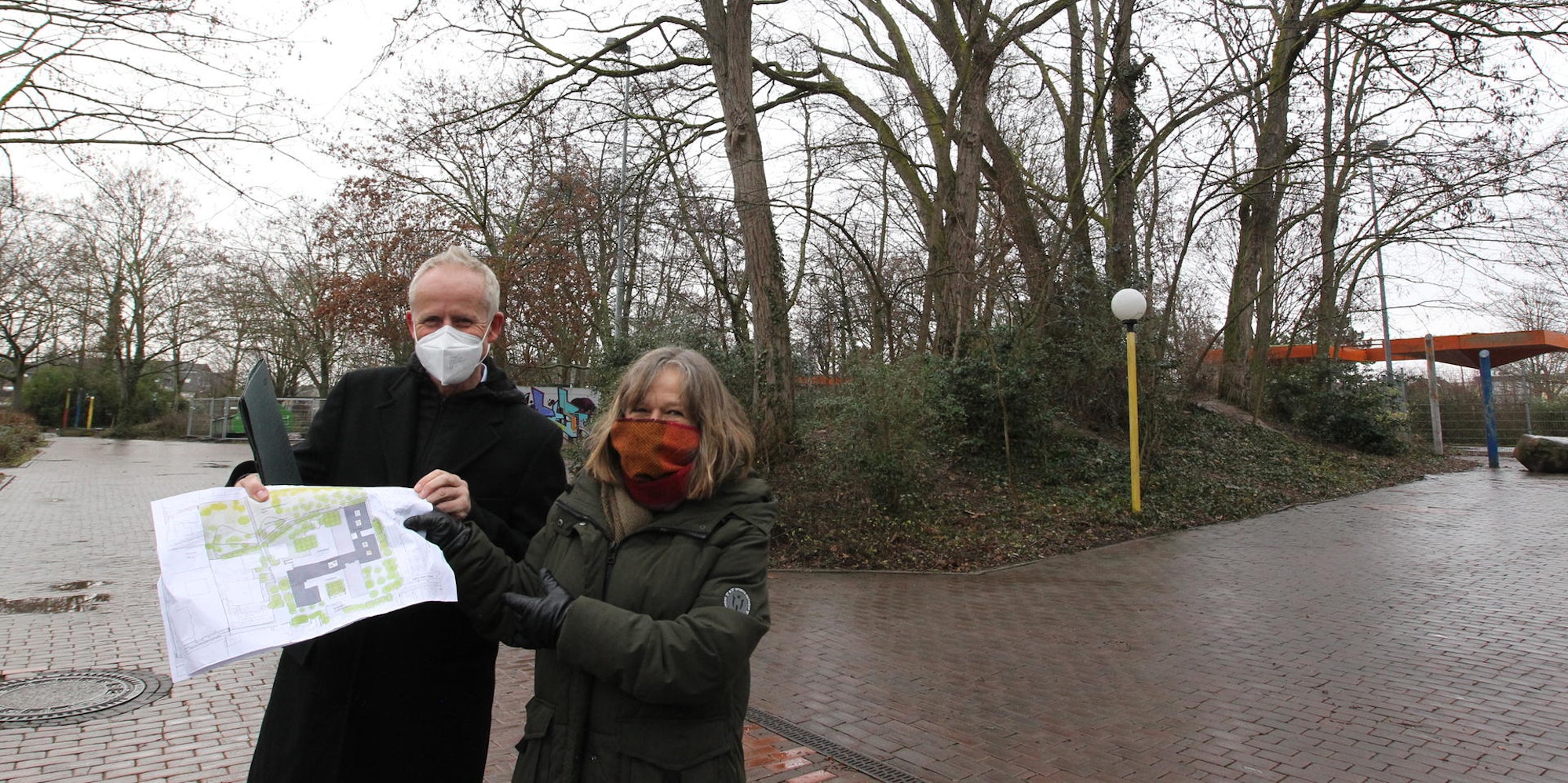 Zahlreiche Bäume müssen wegen des Neubaus der Gesamtschule gefällt werden. Umweltamtsleiterin Ulrike Tesch und der Erste Beigeordnete Walter Schaaf stellten das Projekt vor.