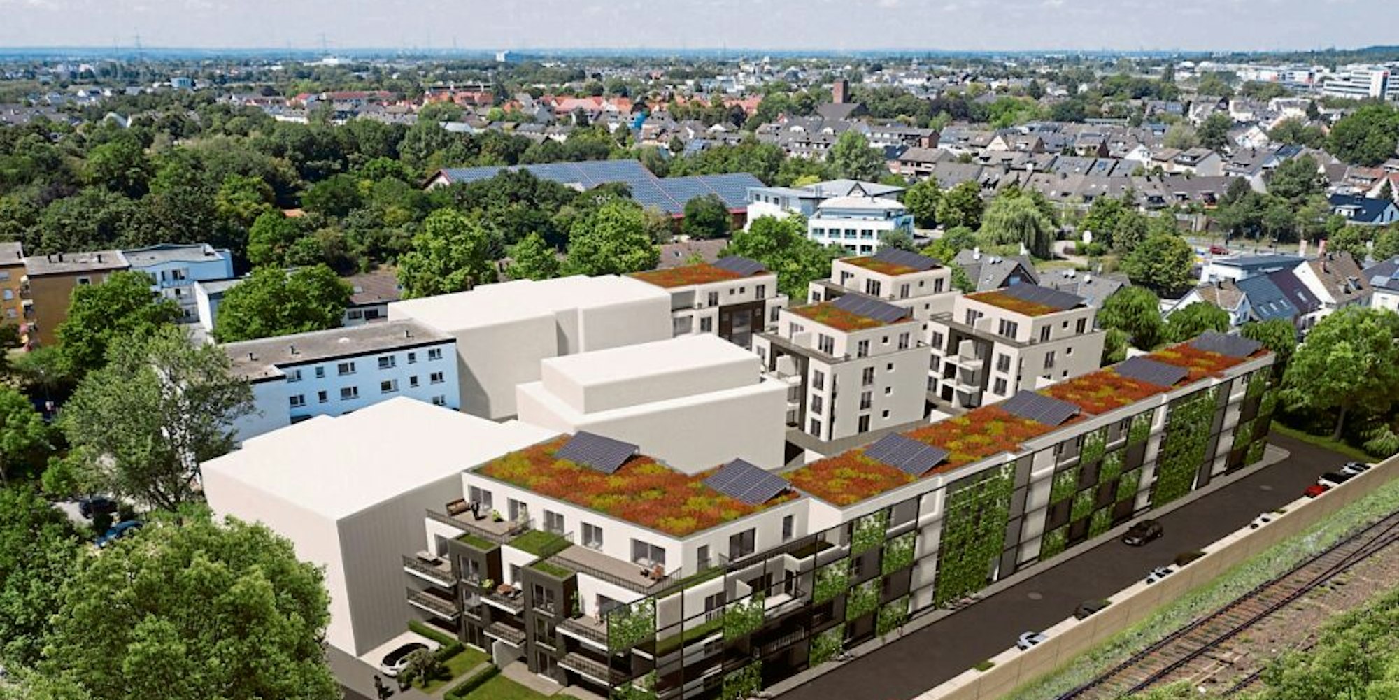 Um den Lärm der Züge abzufedern, gibt es zur Bahntrasse hin eine begrünte Schutzwand. Dort werden die 42 öffentlich geförderten Wohnungen in drei Häusern gebaut. „Troisdorfer Privatinvestoren sind schon gefunden, die sie kaufen werden“, so Schütz.