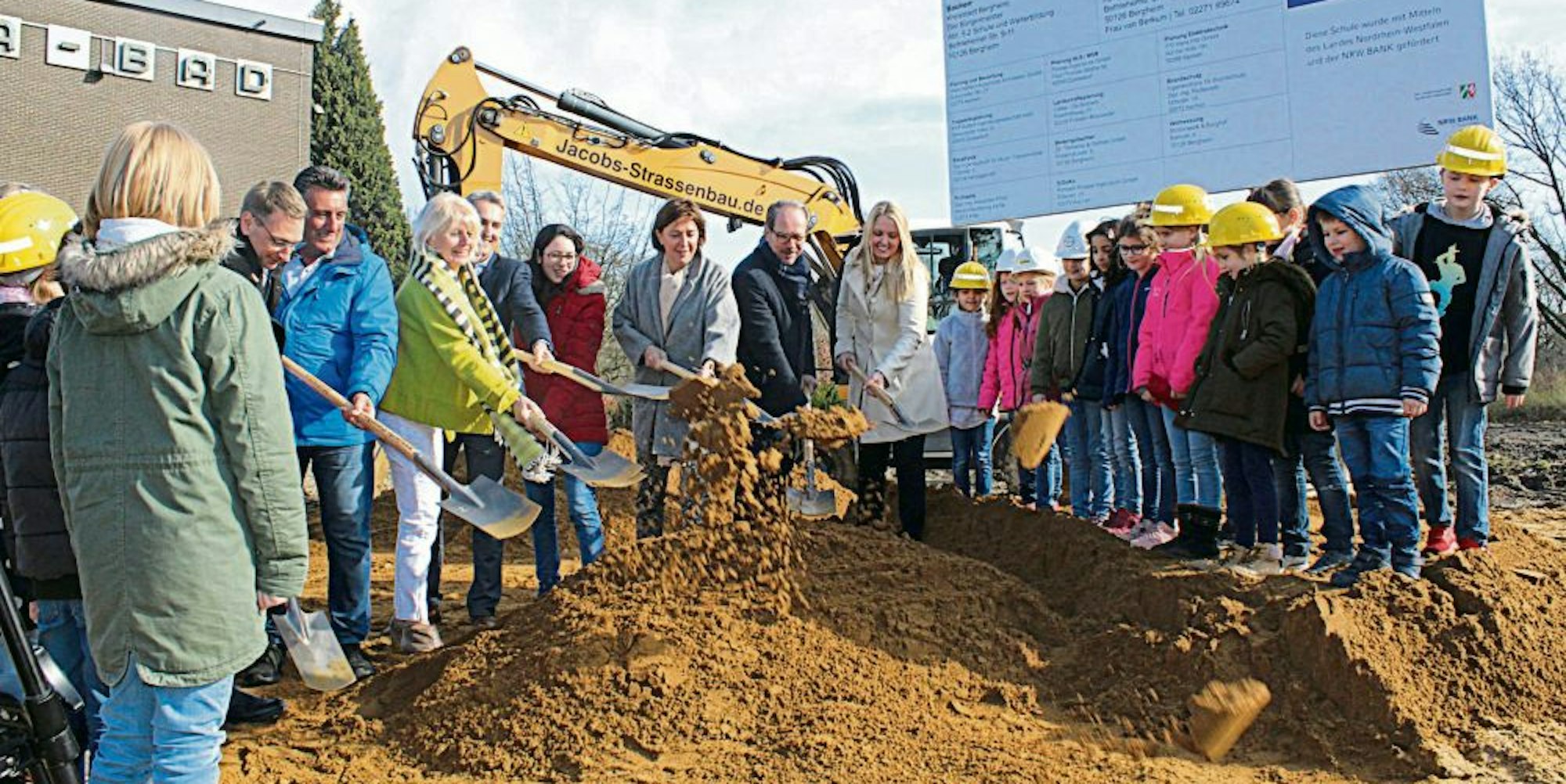 Bergheim-Oberaußem – Die, um die es bei der ganzen Angelegenheit eigentlich geht, nämlich die Kinder, konnten den Startschuss kaum noch abwarten. Mit gelben Baustellenhelmen auf dem Kopf gaben die Zweitklässler der Fortunaschule zum Spatenstich des Neubaus der Fortunaschule ein Ständchen zum Besten: „Jetzt geht’s los“ sangen die Kinder, bevor Vertreter der Parteien, der Verwaltung um Bürgermeister Volker Mießeler, der Schullandschaft und NRW-Schulministerin Yvonne Gebauer das symbolische Häufchen Sand wegschippten.