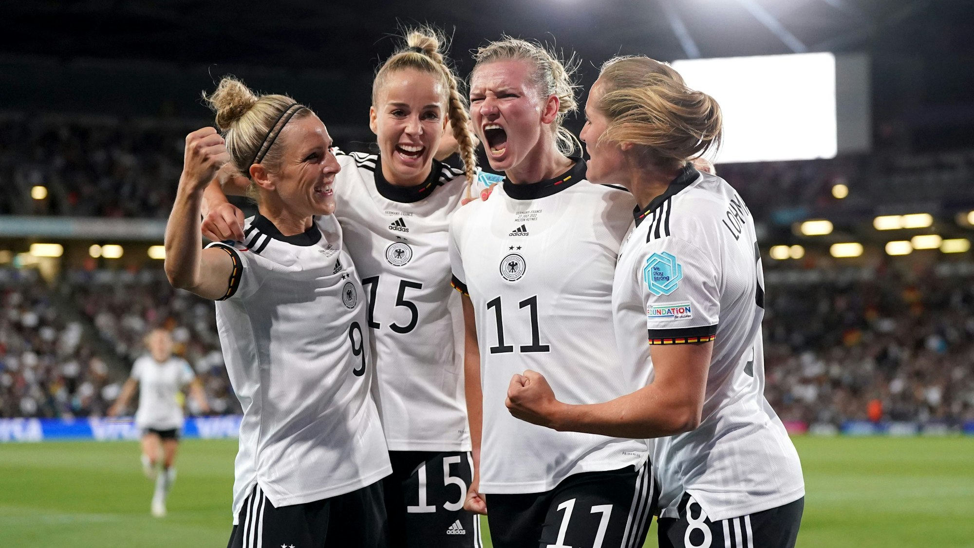 Deutscher Torjubel bei der EM 2022. Zweite von rechts: Kapitänin Alexandra Popp.