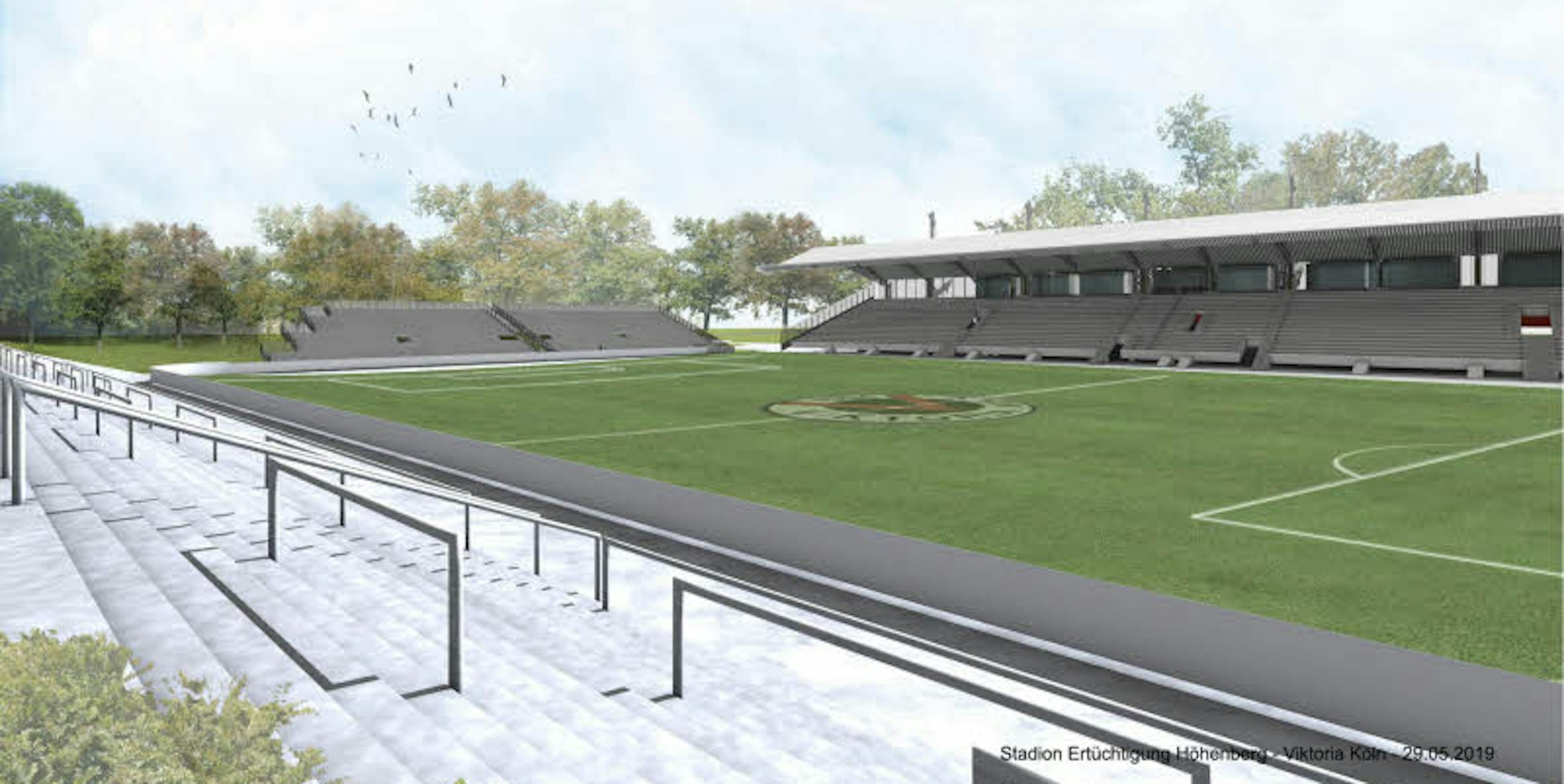 Holger Kirsch, Vizepräsident des FC Viktoria und als Inhaber eines Kölner Architekturbüros federführend verantwortlich für den Umbau, präzisiert die baulichen Maßnahmen und sagt: „Wir werden sogenannte fliegende Bauten errichten. Diese Regelung ist zunächst einmal auf drei Jahre befristet.“
