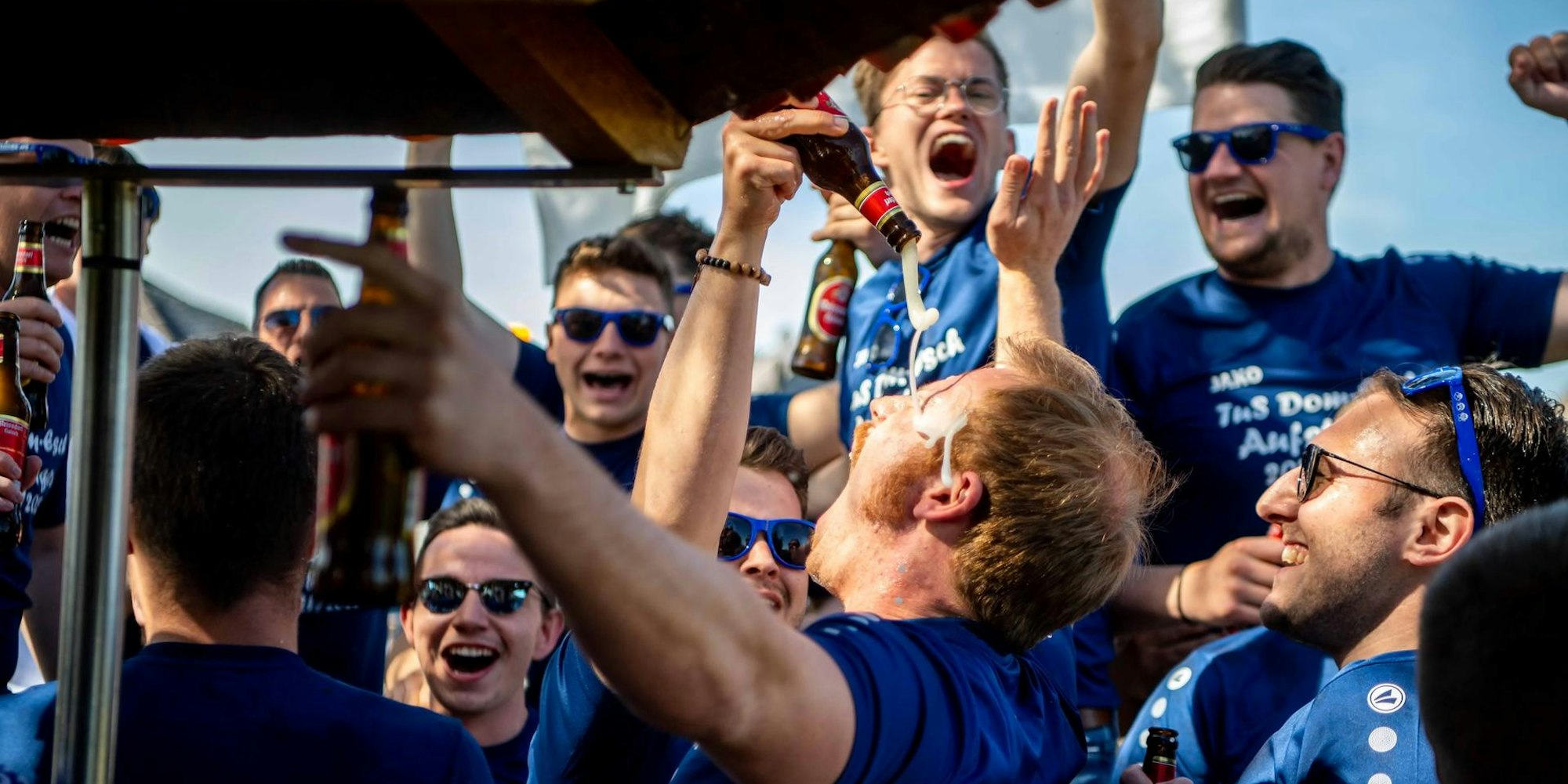 Bierdusche: Die Fußballer des TuS Dom-Esch feierten den Aufstieg ausgelassen. Mittendrin: Michael Schneider.